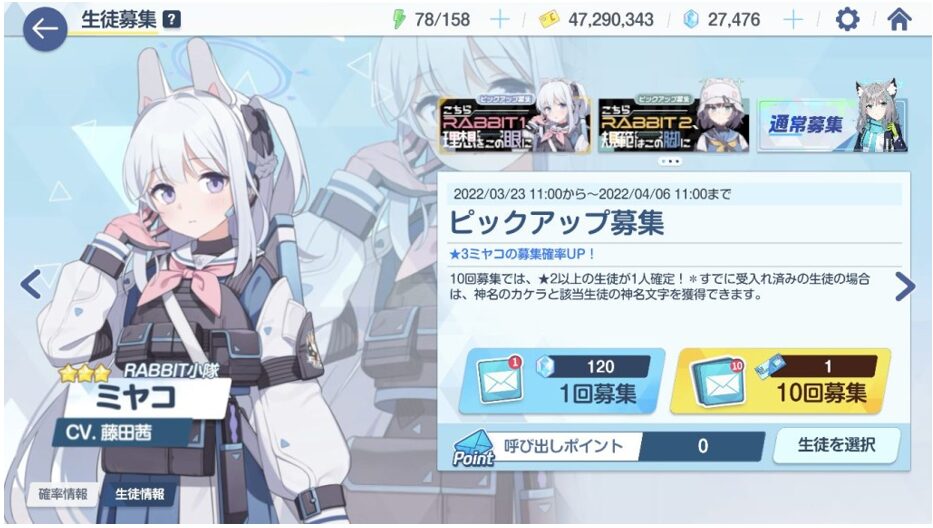 ガチャは、1回引く度に「呼び出しポイント」が1貯まり、呼び出しポイントを200貯めると、ピックアップ中の生徒を選択して呼び出すことができます。