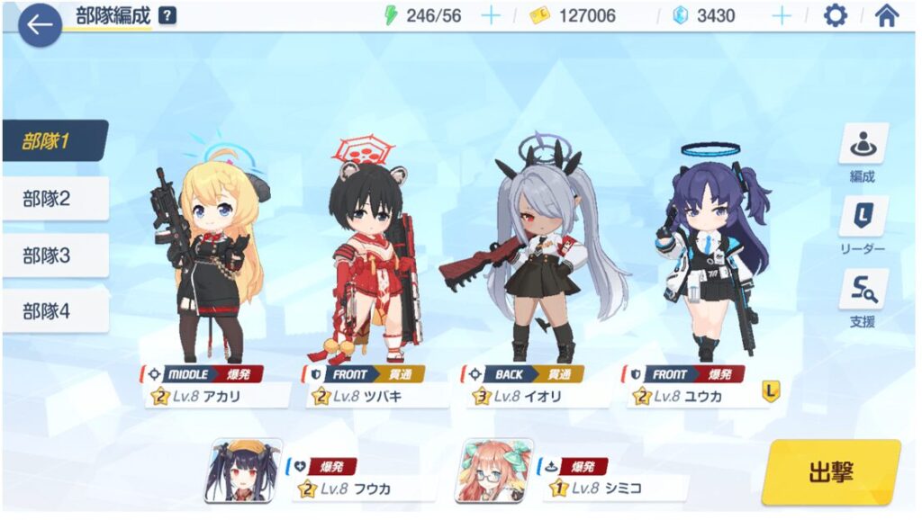 またプレイヤーは、生徒の攻撃スタイル、スキル、市街地戦/屋外戦/屋内戦の適性ポジション、敵との相性など、それぞれの生徒の特性を生かしたパーティを編成する必要があります。