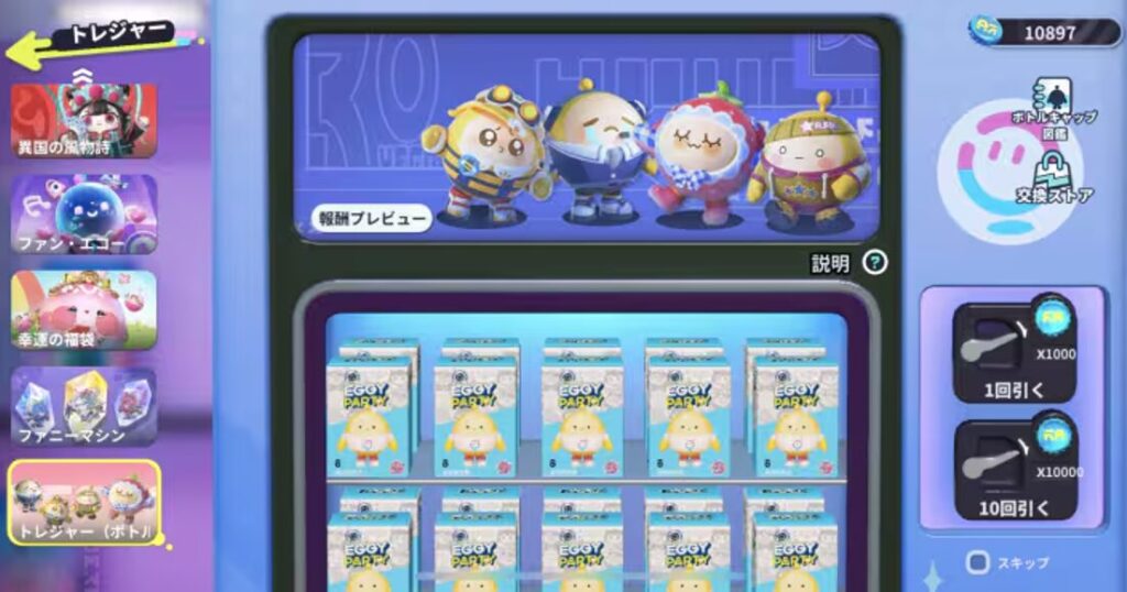 『Eggy Party』には、恒常ガチャだけでなく期間限定のガチャもあり、スキンやアクセサリー、アクションを入手できます。