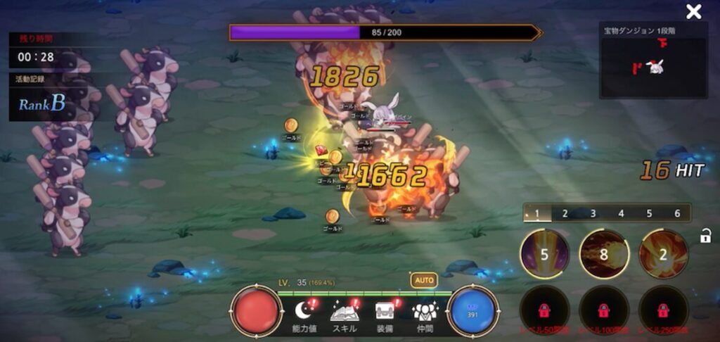 事前にステージを選択しておくと、放置している間にステージが進み、レベルが勝手に上がっていきます。