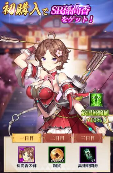 また、初めて元宝を購入すると「初購入ボーナス(初回特典)」がもらえ、SR副将や銅貨、高速戦闘賢などの様々な特典が付いてきます。