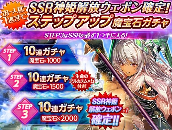 初心者向けのステップアップガチャは、回数に応じてSSRの出現率が上がる形式のガチャで、序盤に手持ちを充実させたいプレイヤーにおすすめです。