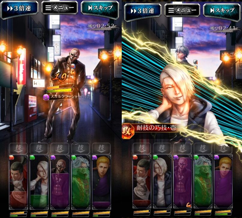 基本的にはフルオートバトルで進行し、「2倍速」「3倍速」「スキップ」を選択して、白熱したバトルをお手軽に楽しむことができます。