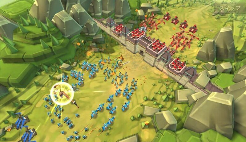 プレイヤーはお互いの城を攻撃し、資源を奪い合い自国を強化していきますが、ギルドに加入していると最大100人vs100人の大規模リアルタイムバトルが始まり、非常に熱い展開になります。