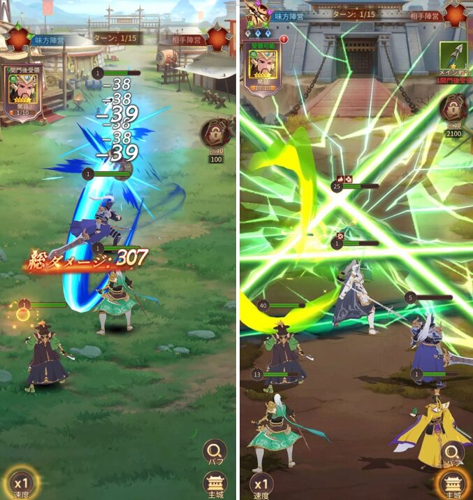 バトルは、事前に武将を5人選びパーティを編成して戦うフルオートバトルとなっていて、倍速機能もあるのでサクサクと進んでいきます。