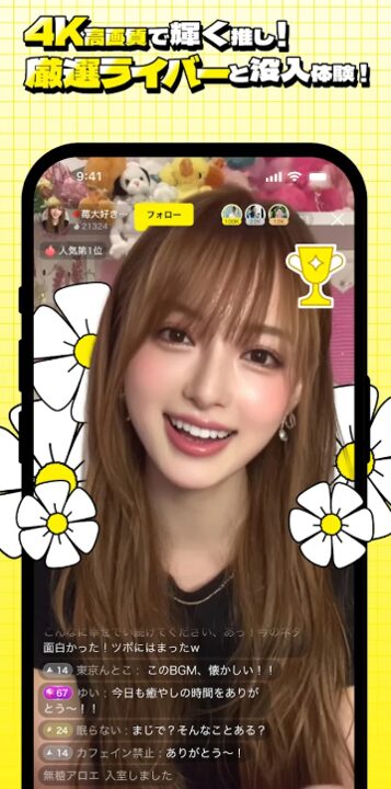 最大の特徴は、これまでのライブ配信の常識を覆す「4K対応の超高画質配信」と「心理的距離の近さ」です。大手アプリのように数万人規模の視聴者が殺到してコメントが流れてしまうのではなく、一人ひとりのリスナーとライバーがしっかりと対話を楽しめる「コミュニティ重視」の設計になっています。