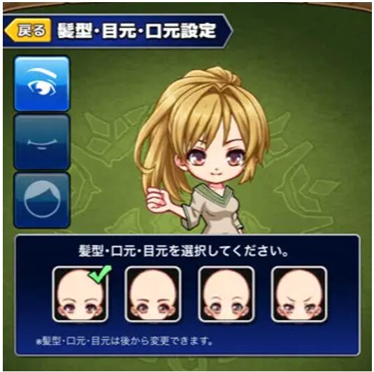 まずはキャラクター作成から始まります。髪型、口元、目元はあとから無料で変更することができるので、ざっくり決めてしまって大丈夫です。