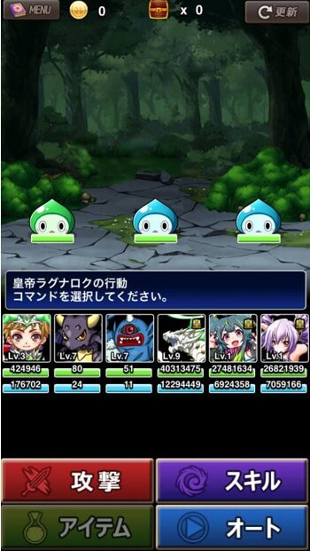 『ミリオンモンスター』のバトル操作は、画面にある「攻撃」「スキル」「アイテム」のコマンドをタップするだけで完了します。