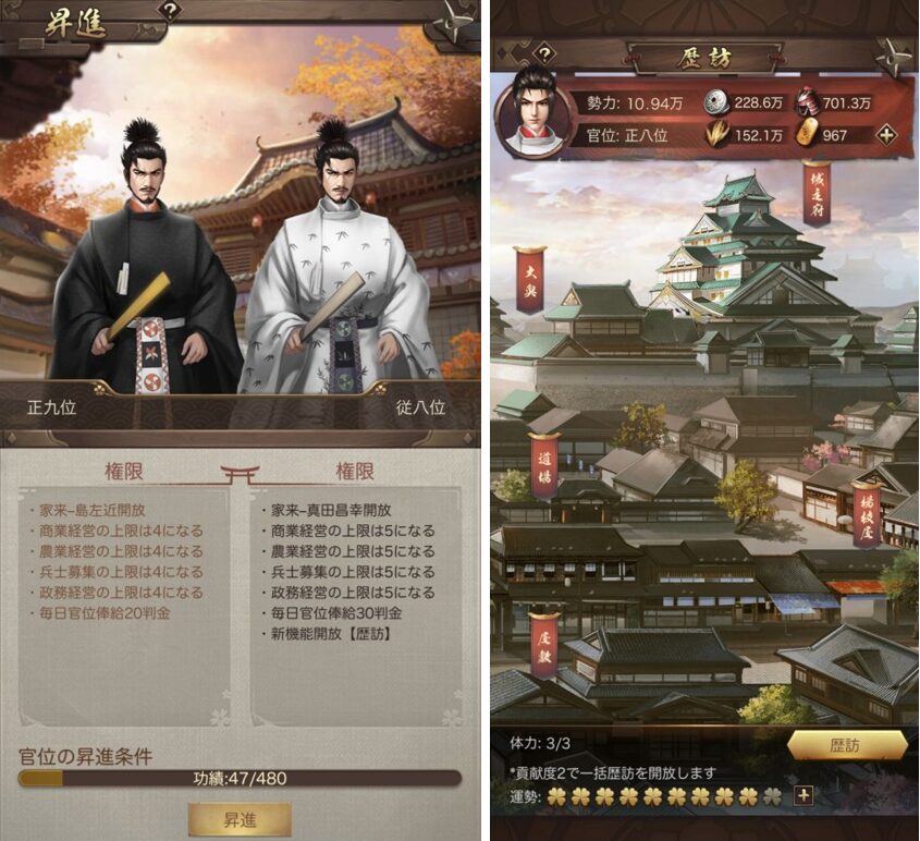 内政などで功績を残したり、戦闘に勝利していくことで、次の階級に昇進していきます。