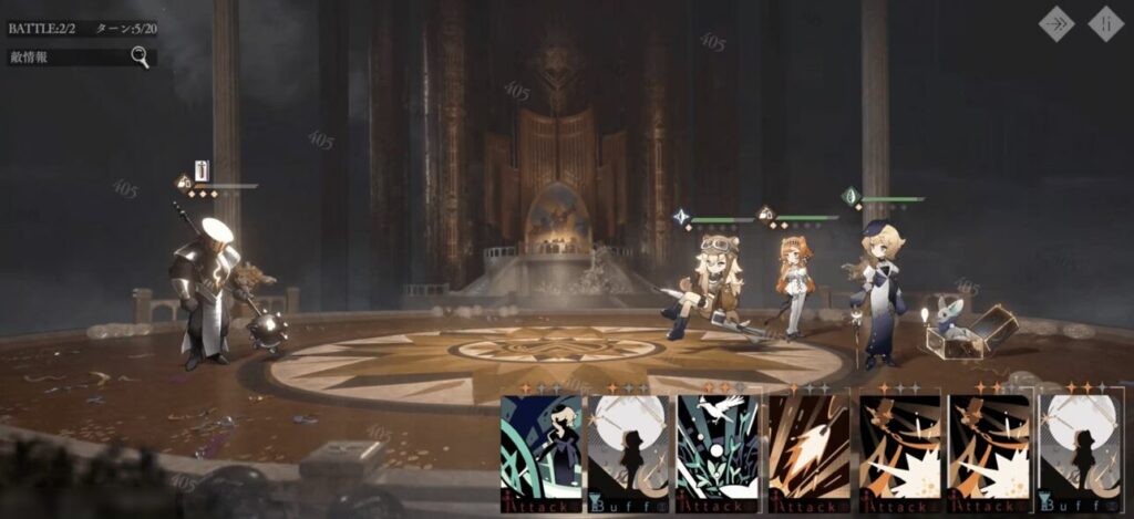 それぞれのキャラクターには属性やステータス、固有のスキルカードが設定されており、最大4人でパーティを組みバトルしていきます。
