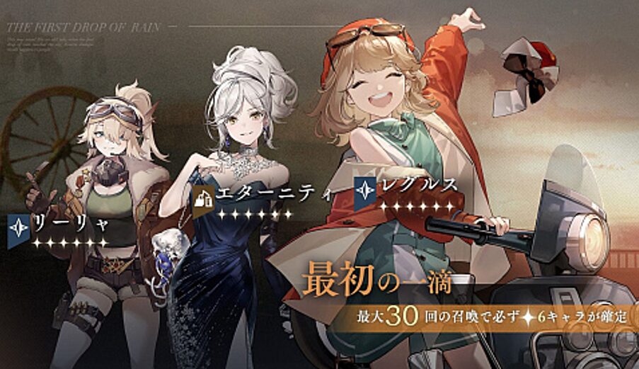 | 最初の一滴 | ・ゲーム開始時から30連限定のガチャ ・30連で★6キャラ1人確定 |