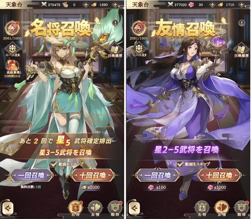 ガチャは専用のガチャチケットや、ゲーム内通貨の「元宝」で引くことができますが、「名将召喚」と「戦将召喚」に関しては1日1回無料で回すことができるので、忘れずに引くようにしましょう。