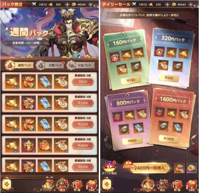 『三国志アナザー 星将の願い』では用意されているパックは以下の4つあり、ゲーム内通貨の「元宝」や、ガチャチケット、アイテムなどが手に入ります。