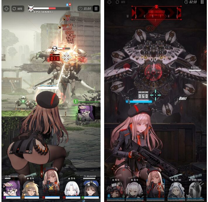 味方5人で攻撃していくため、銃声が鳴り響き、無数の弾丸が飛び交い、次々と敵を撃破していく様は、圧倒的で爽快感抜群です。プレイヤーは、ニケたちのすぐそばで銃撃戦を見ているような感覚になり、臨場感もたっぷり味わえます。