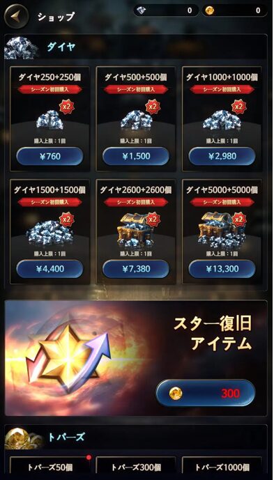 『テンペスト:試練の塔』では、「ダイヤ」と「トパーズ」がゲーム内通貨となっています。