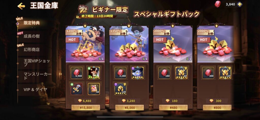 少額で購入できるパックも用意されているので、課金を検討している方はまずは微課金から始めてみることをおすすめします。