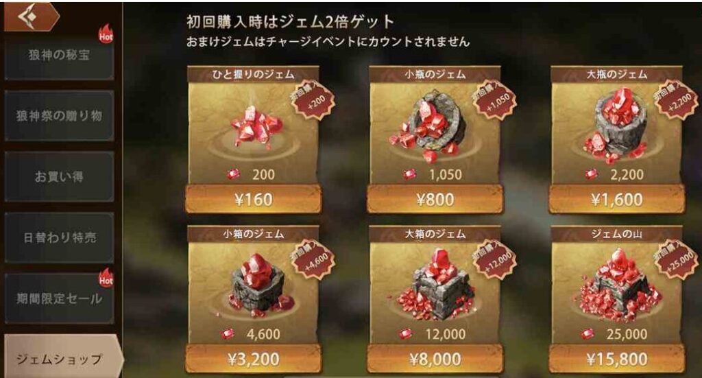 『ウルフゲーム』のゲーム内通貨は「ジェム」となっていて、クエスト報酬やイベント報酬、課金で入手できます。